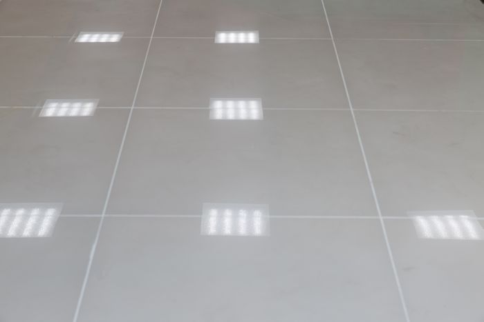 В проекте использовали белый напольный ректифицированный керамогранит с идеальной геометрией 600*600 мм. Монтажники отметили, что "Стандартный белый" керамогранит в плитке немного серого оттенка, но после укладки на контрасте темными цветами выглядит намного ярче.