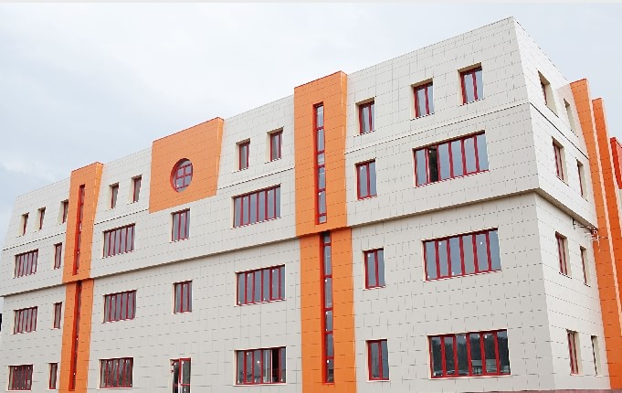 Матовый контрастный керамогранит из специальной фасадной серии отличает низкая цена, точная размерность 600*600 и наличие достаточно ярких цветов, поэтому строительные компании часто заказывают этот матераил.